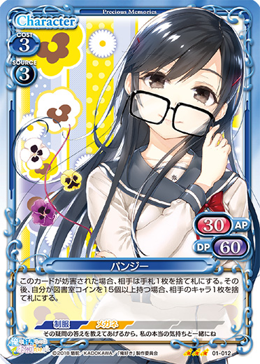 このカードが妨害された場合、相手は手札1枚を捨て札にする。その後、自分が図書室コインを15個以上持つ場合、相手のキャラ1枚を捨て札にする。